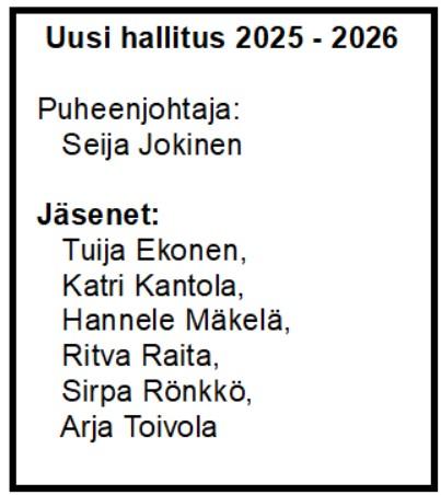Puheenjohtaja: Seija Jokinen, s-posti: seikkuj@gmail.com
